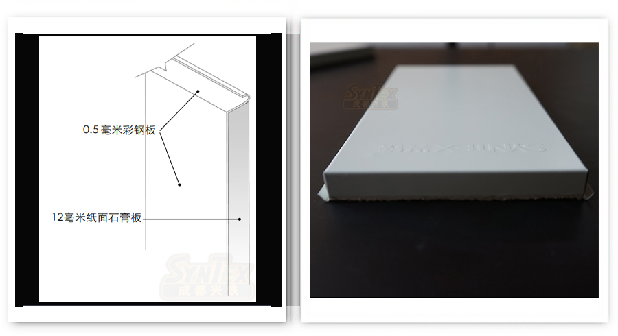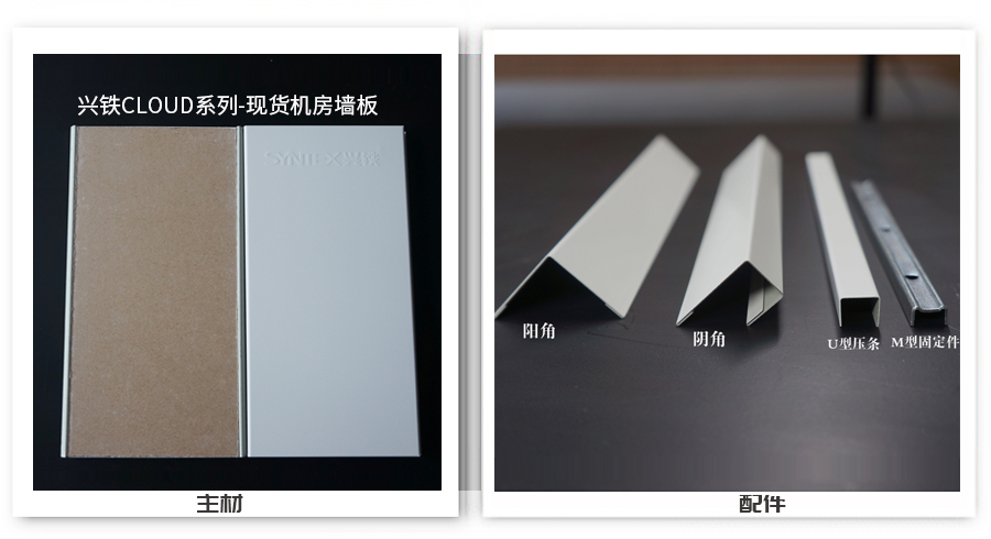 興鐵C系列機房彩鋼板,也叫CLOUD系列,表面材是白色預涂熱鍍鋅鋼板(雙面鍍鋅量60-80g),鋼板符合GB/T 12754標準的規定。具備良好的抗氧化、抗拉強度等性能。背面復合杰森品牌紙面石膏板(12mm),滿足防火、隔音、保溫及強度需求。